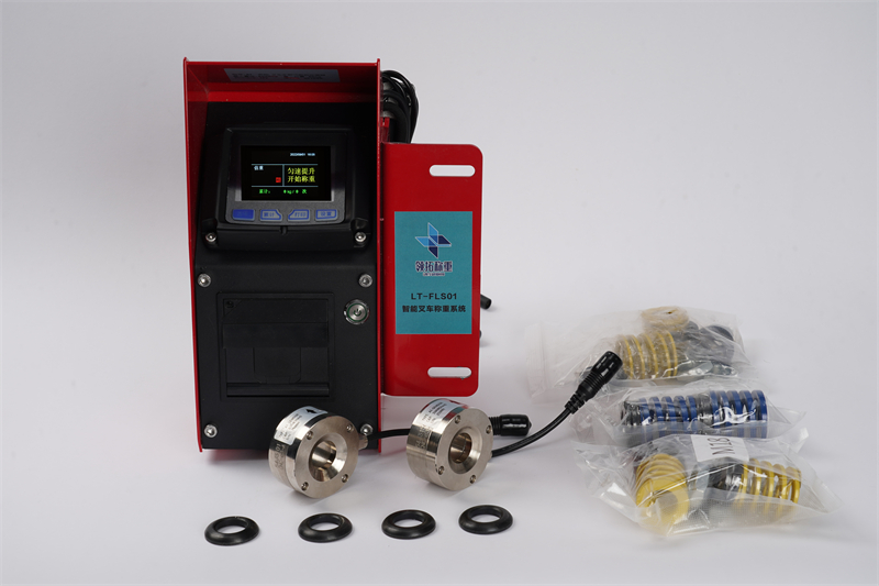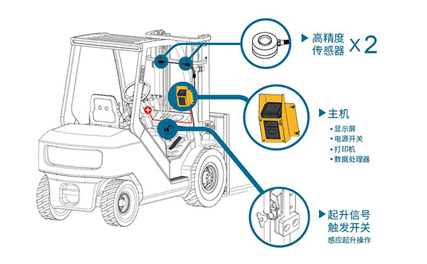 在叉车的链条安装螺栓上加装压力传感器,链条拉着螺杆,然后使传感器受力,螺杆上方有内门架固定,因此是压力受力测出链条的拉力,通过对测得的传感器信号进行智能运算处理,得出称重精准值。